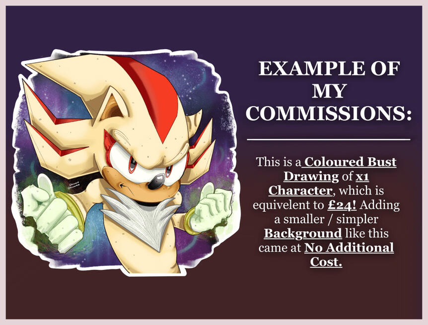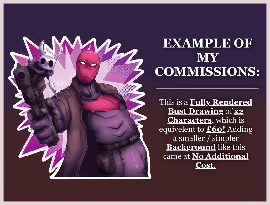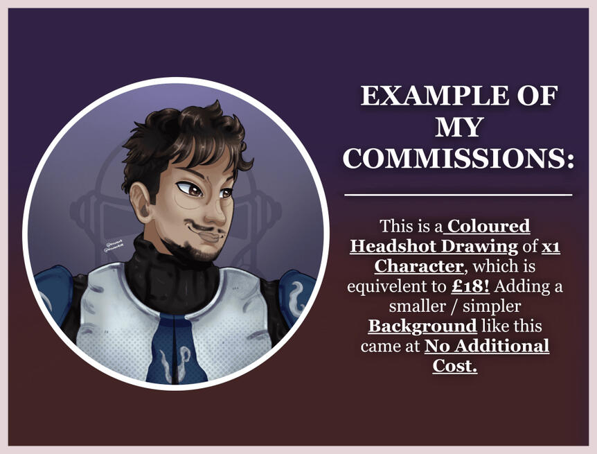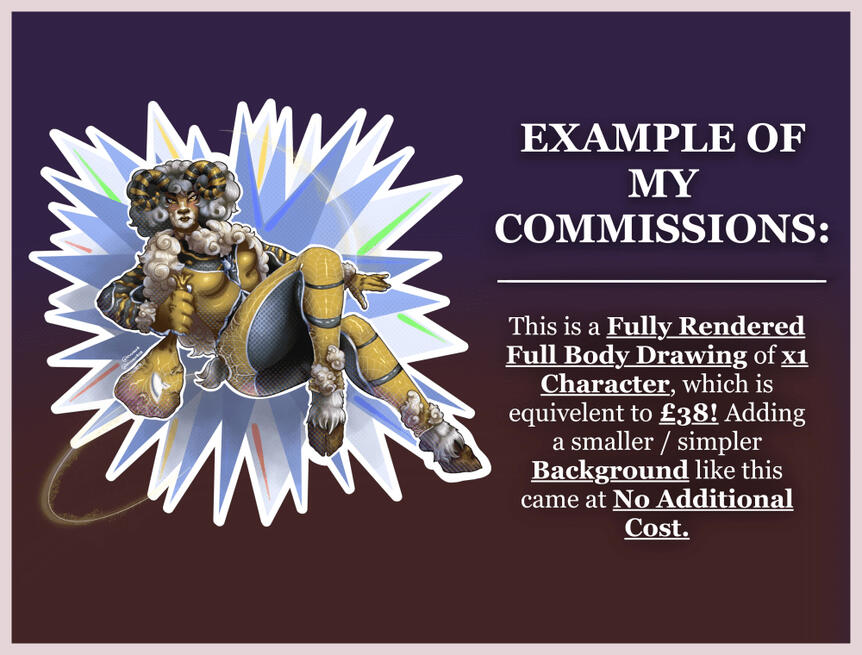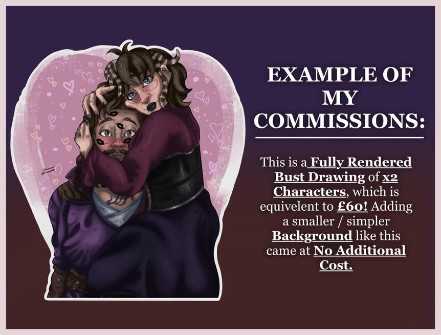 Please DM me on Instagram to either get reminders when my commissions open, or get a commission slot with the following:Your username, commission type, confirmation to reading my Terms of Service, any reference images and / or colour palettes, alongside any desired elements for your commission.